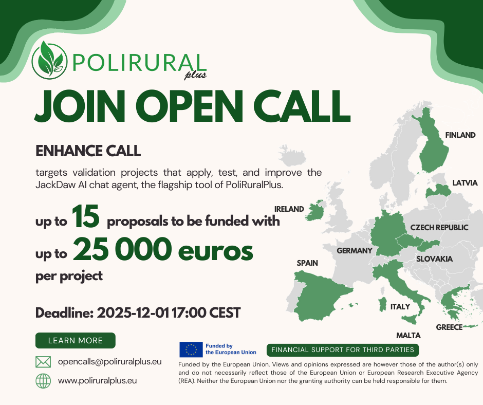 Piedaloties “Pilnveides” (Enhance) konkursā, pretendenti varēs saņemt līdz 25 000 EUR JackDaw — PoliRuralPlus izstrādātā mākslīgā intelekta rīka — validācijai. Dalībnieki pārbaudīs rīka darbību reālos apstākļos, izmantojot to telpiskās informācijas analīzei un kartogrāfisko datu interpretācijai saprotamā tekstā, un sniegs strukturētu atgriezenisko saiti par rīka lietojamību, uzticamību un praktisko vērtību. Rezultāti tiks publicēti projekta komunikācijas kanālos Eiropas līmenī.