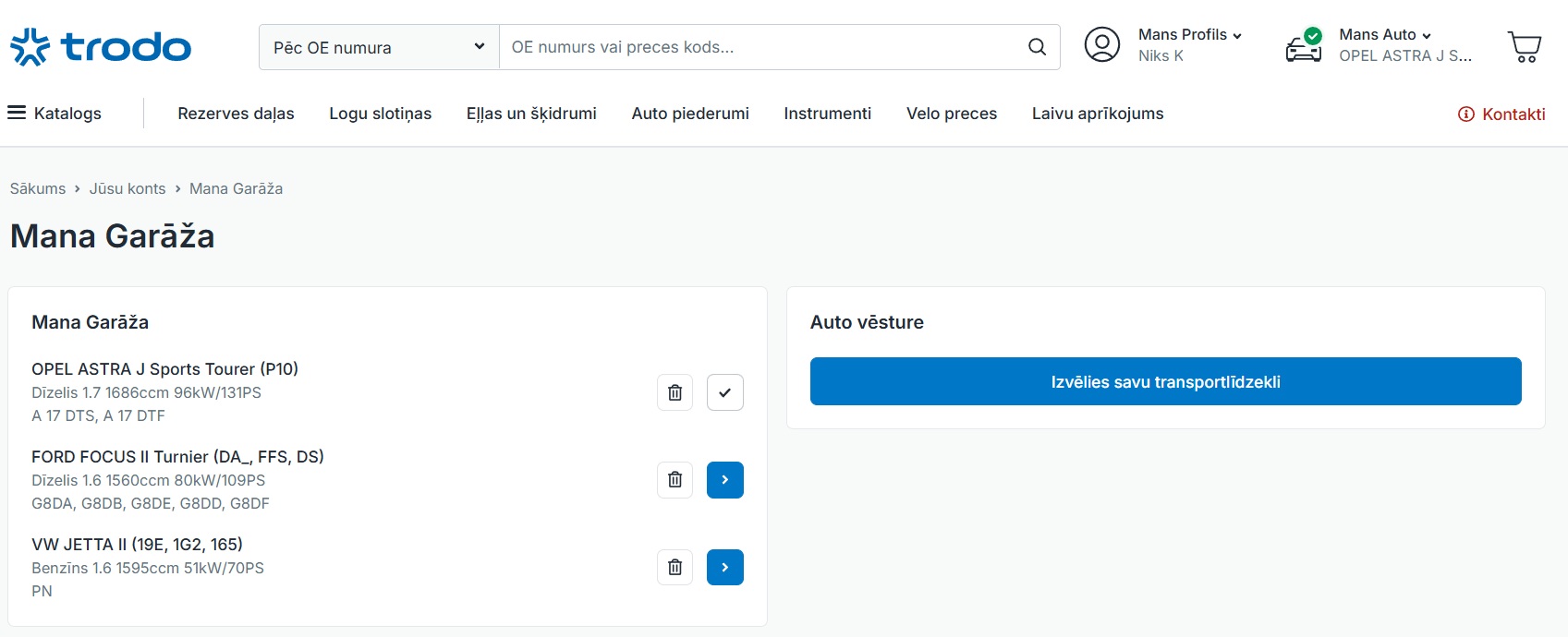 Lai rezerves daļu pasūtīšana būtu vēl ērtāka, Trodo piedāvā funkciju “Mana garāža”, kas ļauj saglabāt vienu vai vairākus automobiļus savā lietotāja profilā. Tas nozīmē, ka katrā nākamajā pasūtījumā automašīna vairs nav jāatlasa no jauna – sistēma automātiski piedāvā detaļas, kas atbilst jau saglabātajam transportlīdzeklim.