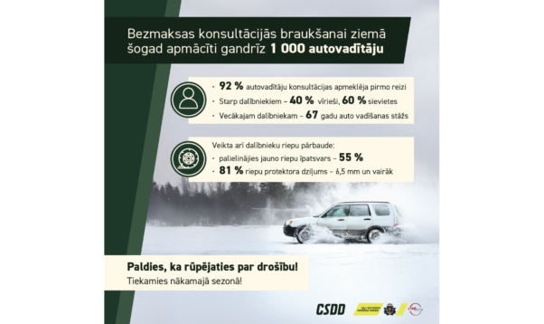 Noslēgušās VAS ”Ceļu satiksmes drošības direkcija” (CSDD) rīkotās bezmaksas konsultācijas šajā ziemas sezonā, kur autovadītāji uzlaboja savas braukšanas iemaņas ziemas laikapstākļos. Šo iespēju ir izmantojuši gandrīz 1000 autovadītāju astoņas Latvijas pilsētās – Rīgā, Jelgavā, Siguldā, Valmierā, Rēzeknē, Liepājā, Madonā un Talsos, portālu “Valmieras Ziņas” informēja CSDD Komunikācijas departamentā.