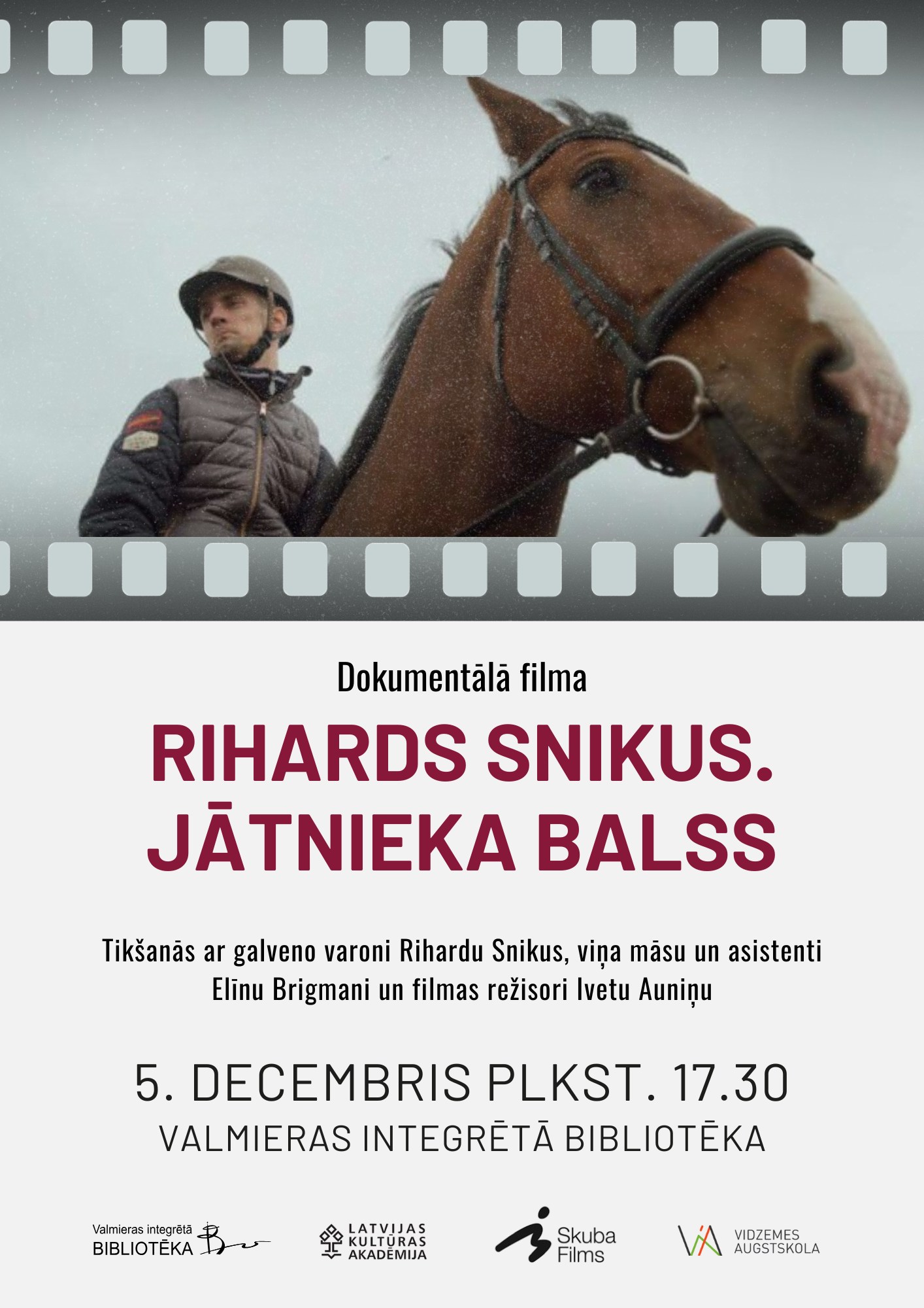 5. decembrī plkst. 17.30 Valmieras Integrētajā bibliotēkā visi laipni aicināti bez maksas noskatīties Ivetas Auniņas dokumentālo filmu “Rihards Snikus. Jātnieka balss”. Būs iespēja tikties ar filmas režisori un scenārija autori Ivetu Auniņu, filmas galveno varoni, izcilo paralimpieti Rihardu Snikus un viņa māsu, asistenti Elīnu Brigmani.