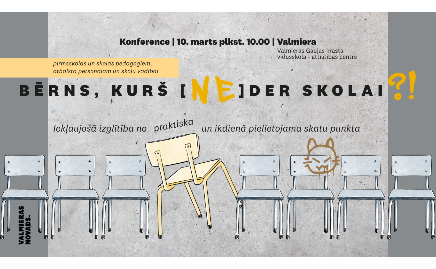 2026. gada 10. martā no plkst. 10.00 līdz 17.00 Valmierā, Valmieras Gaujas krasta vidusskolā – attīstības centrā (Pāvila Rozīša iela 5), notiks konference “Bērns, kurš [ne]der skolai?!” – no sistēmas līdz cilvēkam, kas veltīta iekļaujošās izglītības jautājumiem no praktiska un ikdienā pielietojama skatu punkta.