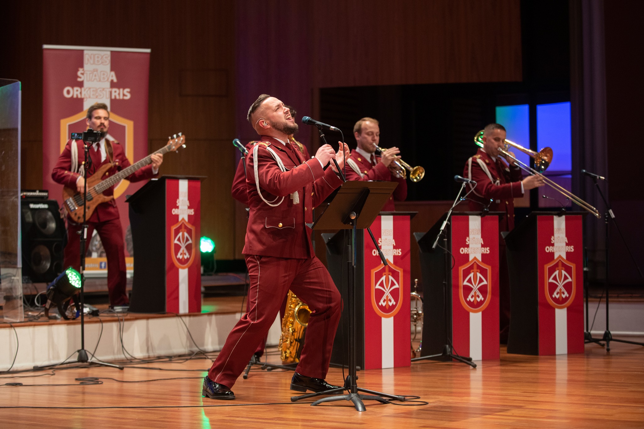 Koncertā uzstāsies solists seržants Gatis Supe, komponists, aranžētājs un pianists seržants Sergejs Austris Universs, saksofonists seržants Lauris Suvaizdis, trompetists Klāvs Borozdins, trombonists štāba virsseržants Artis Greckis, sitaminstrumentālists virsseržants Rinalds Jukna, estrādes ansambļa vadītājs un basģitārists seržants Kaspars Orehovs.