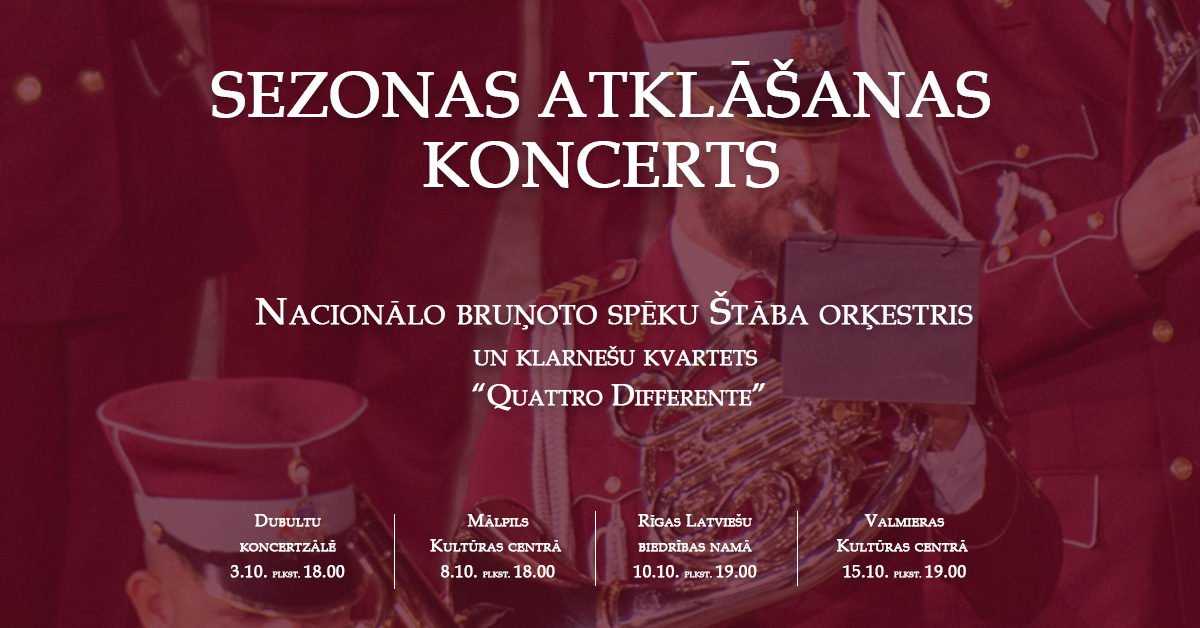 Latviskums Nacionālo bruņoto spēku Štāba orķestrī vienmēr ir bijis godā, tāpēc koncertsezonas atklāšanas koncertu vadmotīvs ir mīlestība pret Latviju. Koncerta atklāšanā būs dzirdama latviešu pūtēju orķestru mūzikas pamatlicēja Gunāra Ordelovska kompozīcija “Svētku mūzika”, turpinājumā vairākkārt godalgotā komponista Riharda Zaļupes spilgtā kompozīcija par latviešu tautasdziesmas tēmu “Rikšiem bērīt’ es palaidu”, un Sergeja Austra Universa tautiskuma caurstrāvoto skaņdarbu “Tālavas taurētājs”, kura ievadā tiek izmantots latviešu tautas meistaru radītas bērza tāss taures dobji patīkamais skanējums.