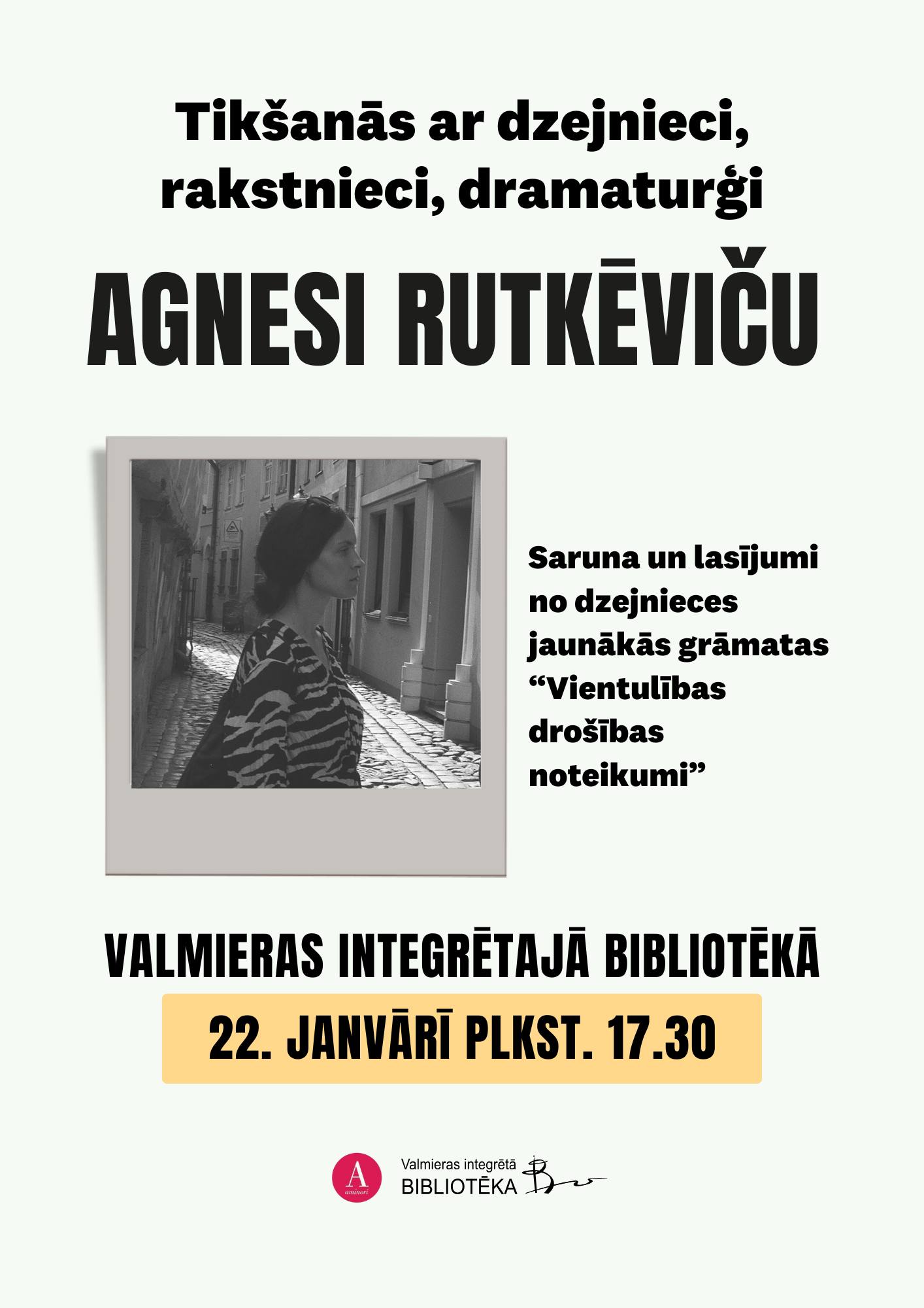 22. janvārī plkst. 17.30 Valmieras Integrētajā bibliotēkā visi laipni aicināti uz tikšanos ar dzejnieci, rakstnieci, dramaturģi Agnesi Rutkēviču.