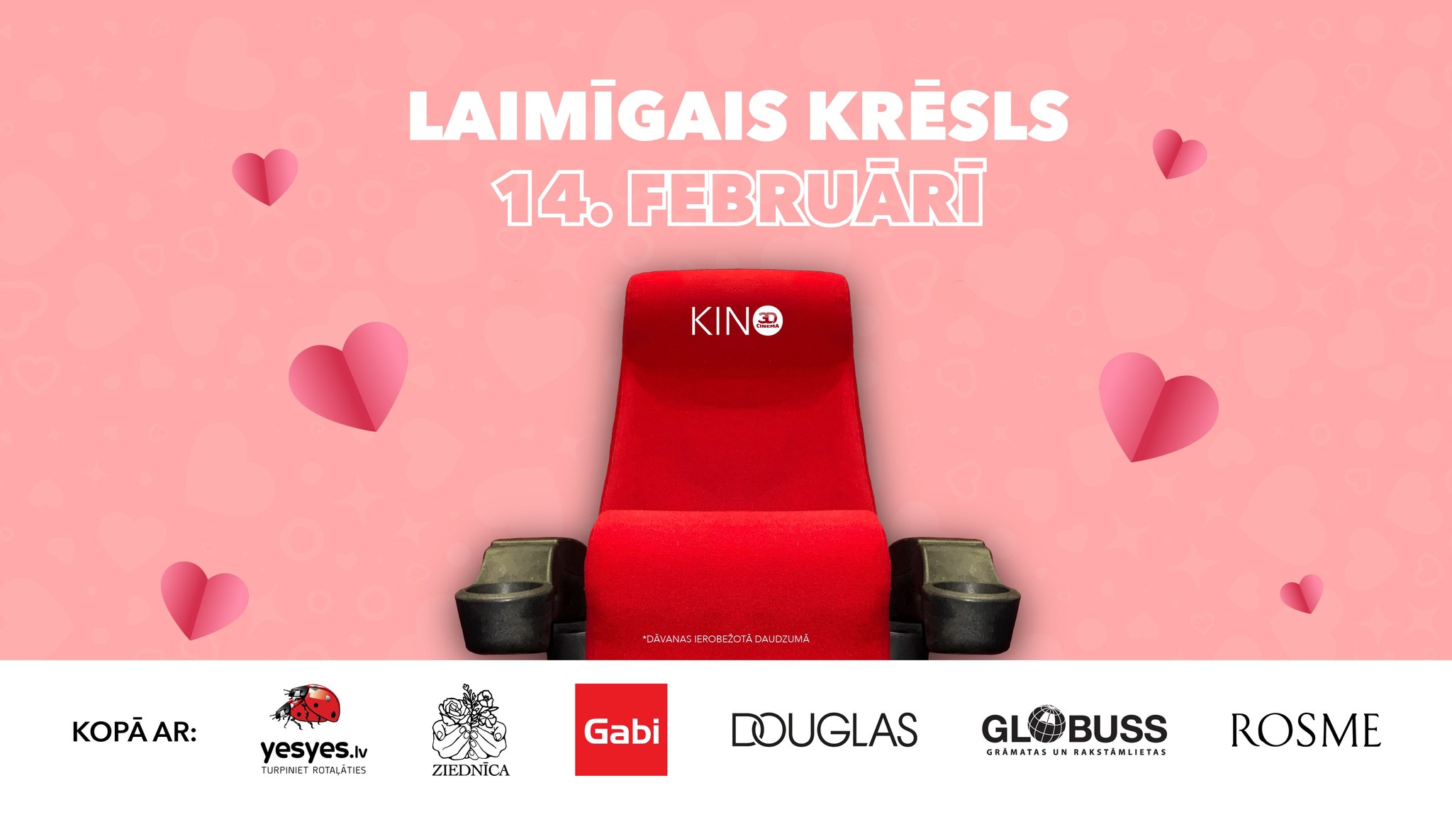 *Dāvanas ierobežotā skaitā un akcija spēkā tikai 14.02.2026 uz seansiem ar atzīmi “laimīgais krēsls”. Laimīgais krēsls būs atzīmēts ar īpašu atzīmi.