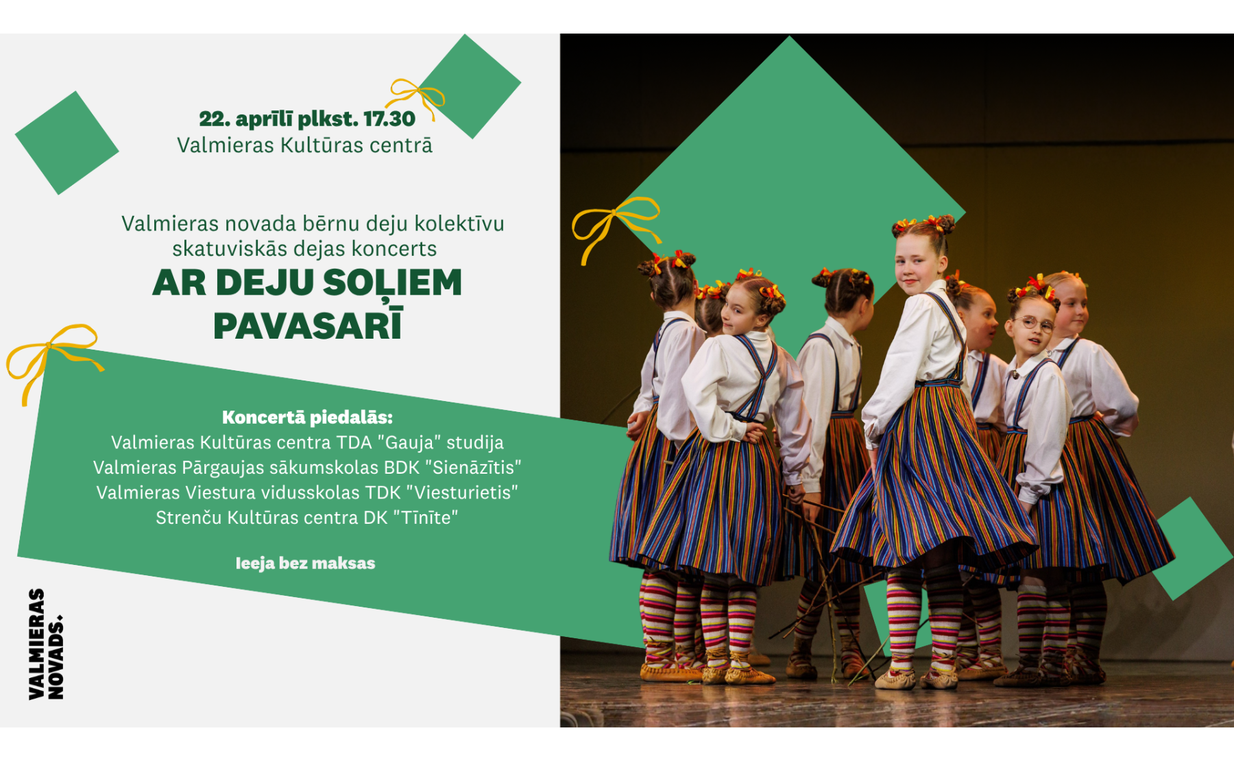 Koncertā piedalīsies: Valmieras Kultūras centra TDA “Gauja” studija, Valmieras Pārgaujas sākumskolas BDK “Sienāzītis”, Valmieras Viestura vidusskolas TDK “Viesturietis”, Strenču Kultūras centra DK “Tīnīte”.