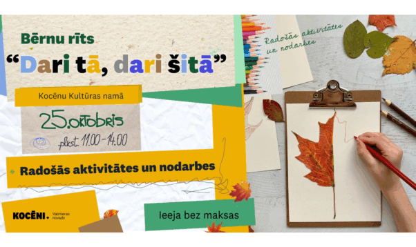 25. oktobrī no plkst. 11.00 līdz plkst. 14.00 aicinām bērnus un ģimenes uz radošo rītu “Dari tā, dari šitā” Kocēnu Kultūras nama kamīnzālē, portālu “Valmieras Ziņas” informēja Valmieras Kultūras centra mārketinga projektu vadītāja Līga Tarbuna.