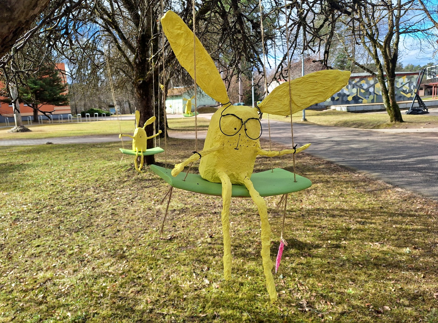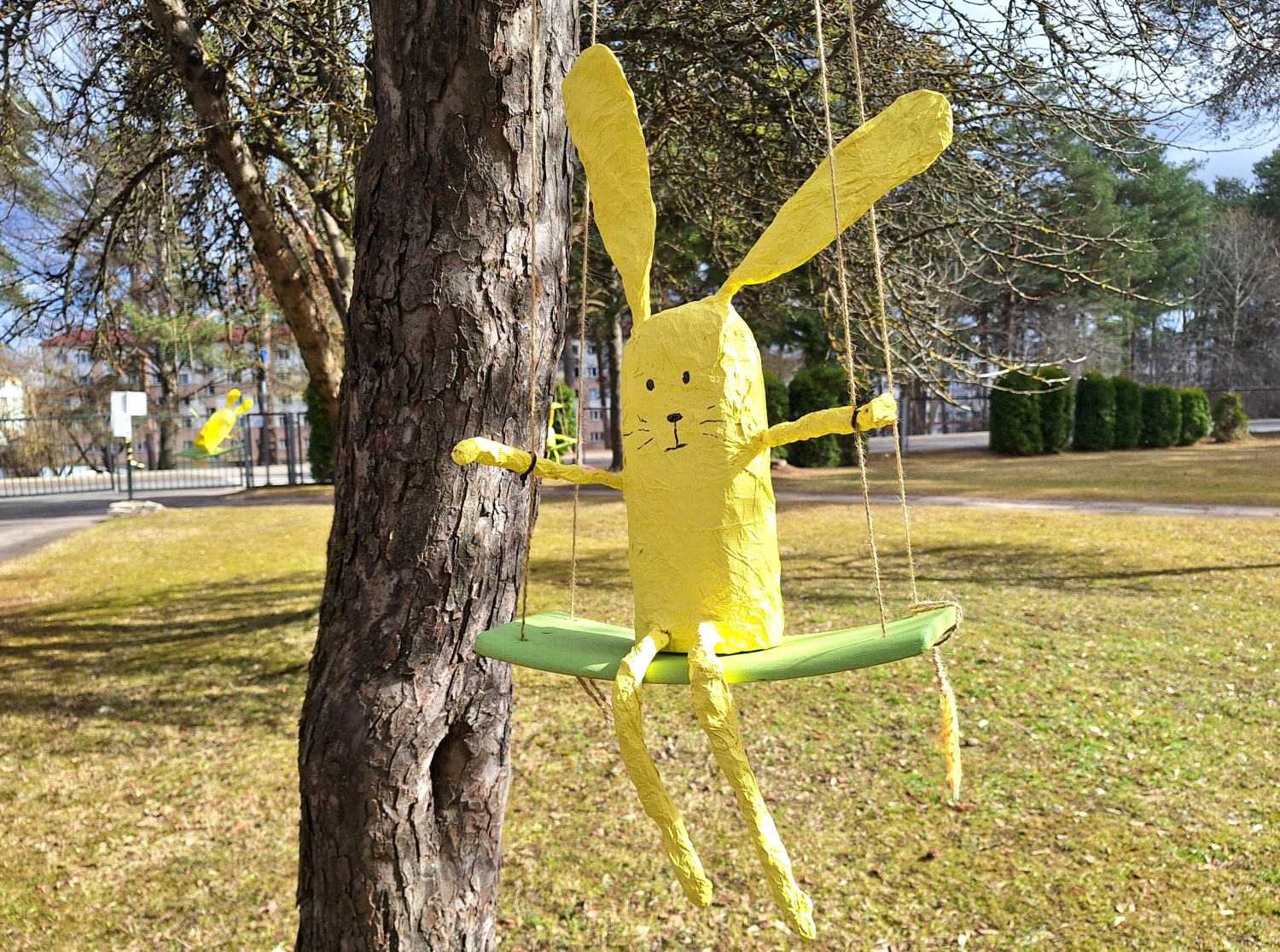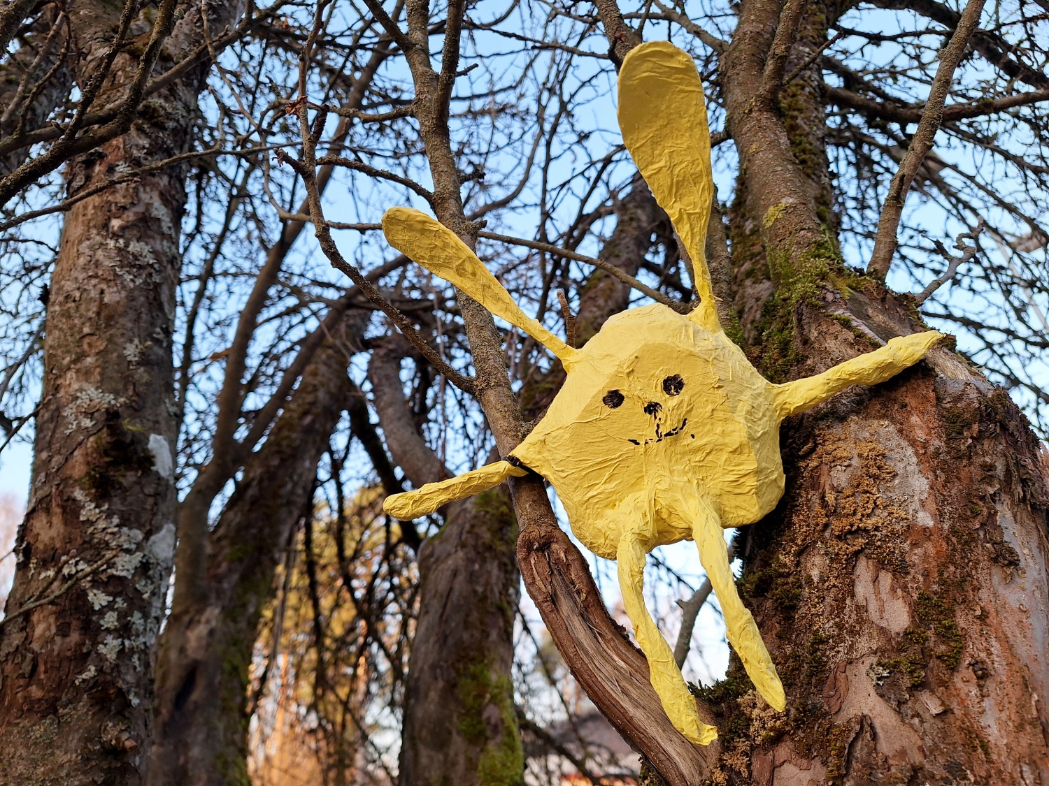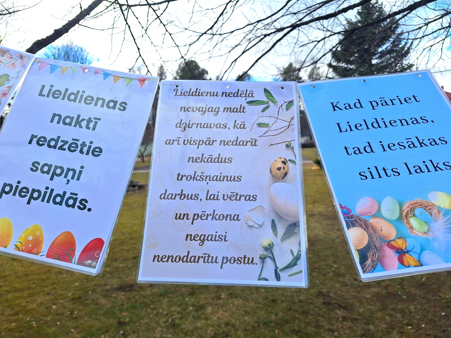 Pirmie kokos laikam parādījās dzeltenie zaķēni – daži šūpojās, spriganākie bija uzlēkuši koku zaros. Tad starp krūmiņiem parādījās citas sugas zaķi un uzplauka arī košas tulpes. Ja kāds bija piemirsis, kas īsti Lieldienās jādara, tad to varēja izlasīt gaumīgi izliktajos atgādinājumos, kas reizēm vējā plandījās kā drēbes uz veļas šņores. Te varēja izlasīt arī laika vērojumus: Kad vardes pa Lieldienām iet pār lielceļu, tad sagaidāma lietaina vasara; Kad pāriet Lieldienas, tad iesākas silts laiks.