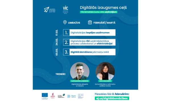 Limbažu un citi Vidzemes uzņēmēji aicināti izmantot iespēju un pieteikties dalībai mācību ciklā līdz 2. februārim, sazinoties ar projekta uzņēmumu koordinatori Anci Veinbergu (tālr. +371 28018005, e-pasts: ance.veinberga@valmierasnovads.lv) vai piesakoties elektroniski: ej.uz/digitālāsmācības. Ar detalizētu programmu iespējams iepazīties Valmieras Attīstības aģentūras mājaslapā – https://developvalmiera.lv/macibu-cikls-uznemumiem-digitalas-izaugsmes-cels-turpinas-nakama-pietura-limbazi/.