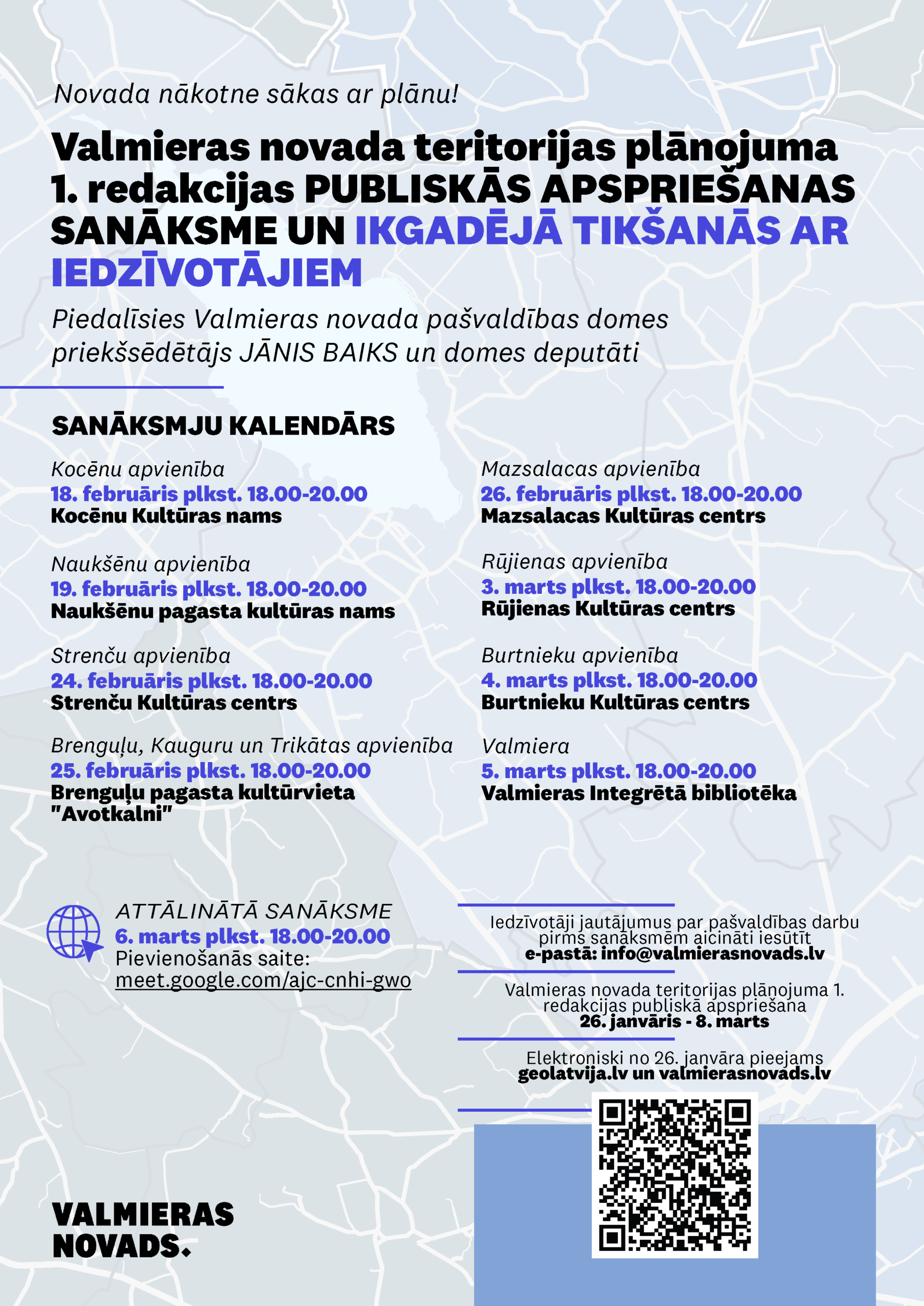 Līdz 2026. gada 8. martam Valmieras novada pašvaldībai var turpināt rakstiski iesniegt iesniegumu ar saviem priekšlikumiem, ierosinājumiem un ieteikumiem, pamatojot nepieciešamās izmaiņas, kas būtu jāparedz teritorijas plānojumā. Tos var izteikt: