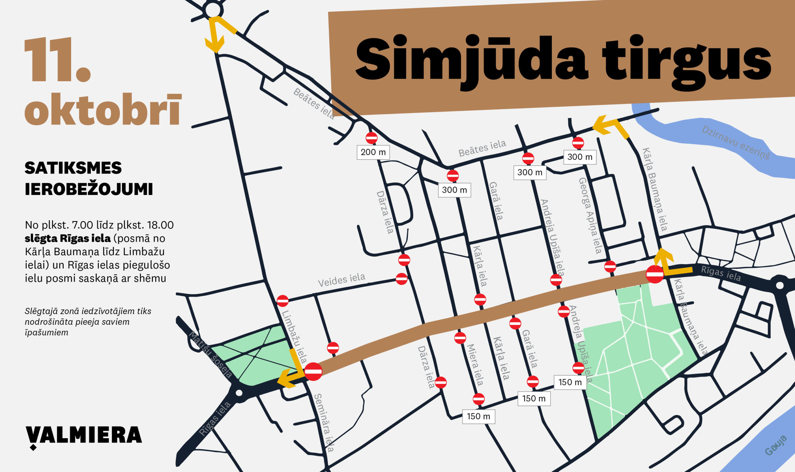 Valmierā norisinoties Simjūda tirgum, 11. oktobrī no plkst. 7.00 līdz 18.00 būs izmaiņas satiksmes organizācijā, portālu “Valmieras Ziņas” informēja Valmieras novada pašvaldības Zīmolvedības un sabiedrisko attiecību nodaļas vadītājas vietniece Zane Bulmeistare.
