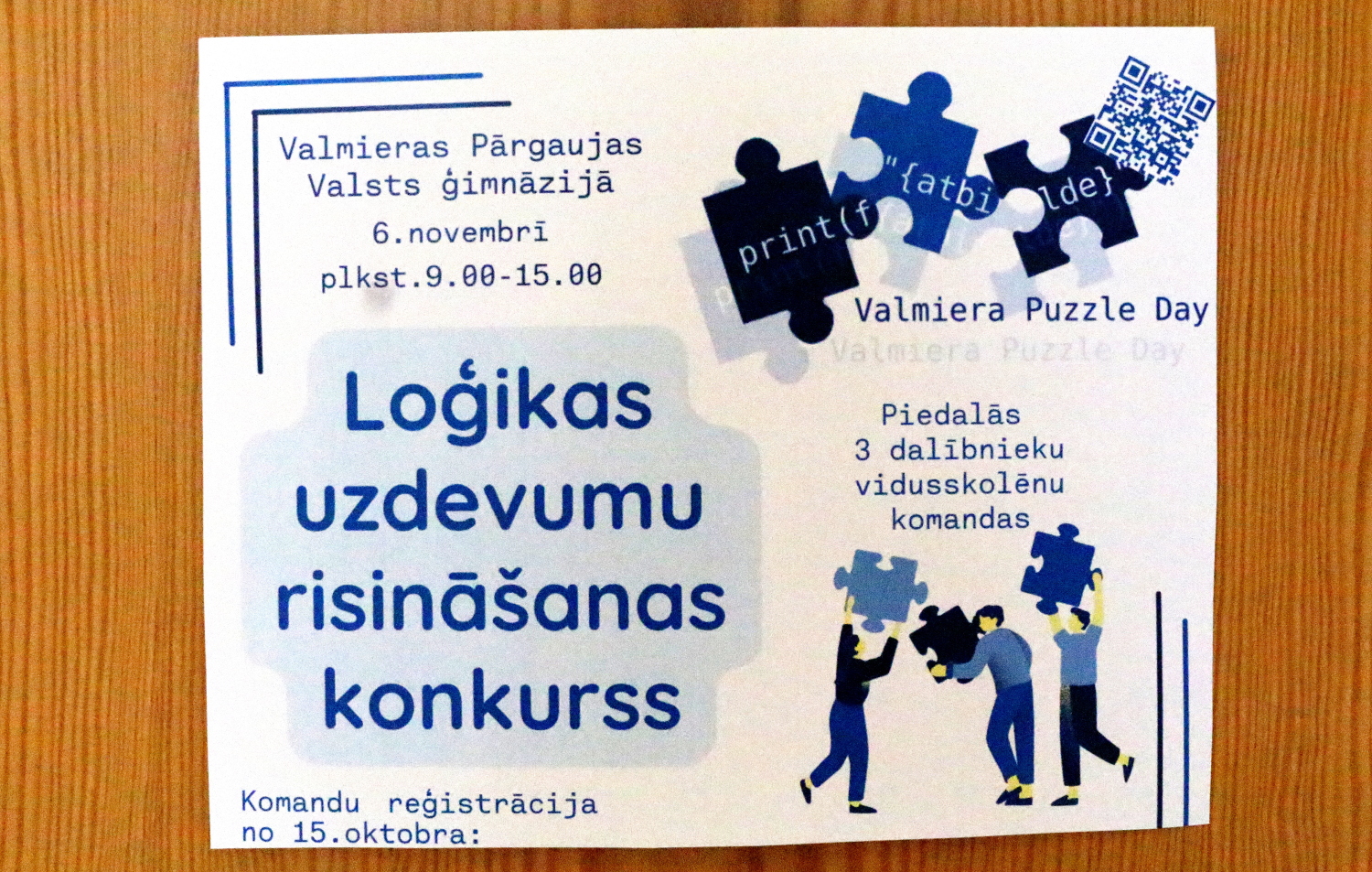 Ceturtdien, 6.novembrī, Valmieras Pārgaujas Valsts ģimnāzijā (VPVĢ) jau trešo gadu norisinājās loģikas uzdevumu risināšanas konkurss “Valmiera Puzzle Day 2025”. Šogad tajā piedalījās rekordliels dalībnieku skaits – 25 komandas (75 skolēni). Viskuplākā skaitā bija ieradusies Valmieras Valsts ģimnāzija – 12 komandas, Valmieras Pārgaujas Valsts ģimnāziju pārstāvēja 8 komandas, Valmieras 5.vidusskolu – 3 komandas un Valmieras Viestura vidusskolu – 2 komandas.