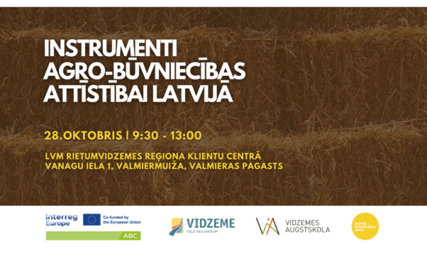 Pasākumu īsteno Vidzemes plānošanas reģions un Vidzemes Augstskola sadarbībā ar Jaunās būvniecības skolu, INTERREG EUROPE projekta Agro Building Carbon (ABC) ietvaros.