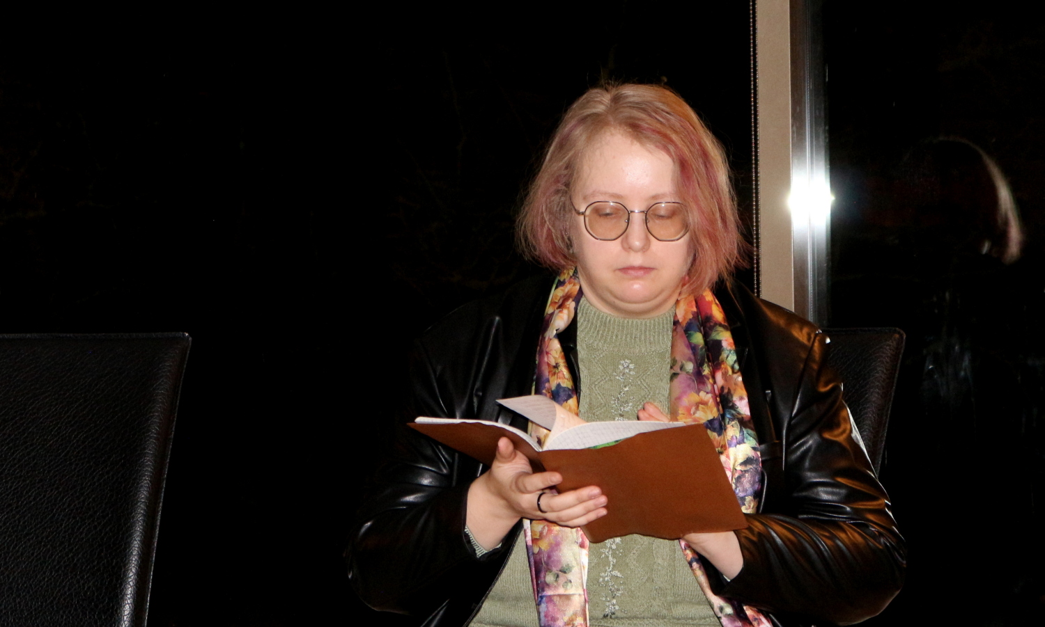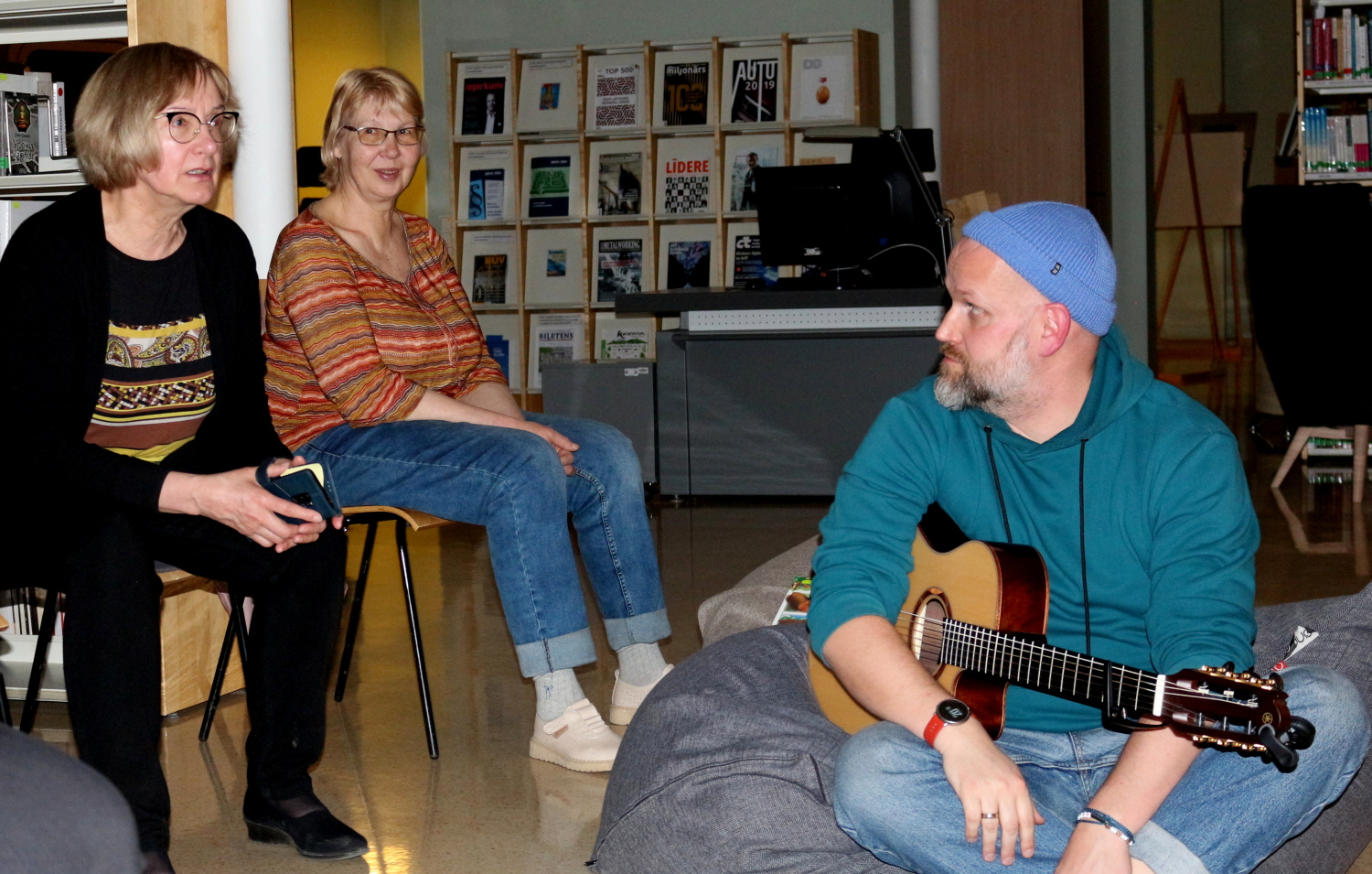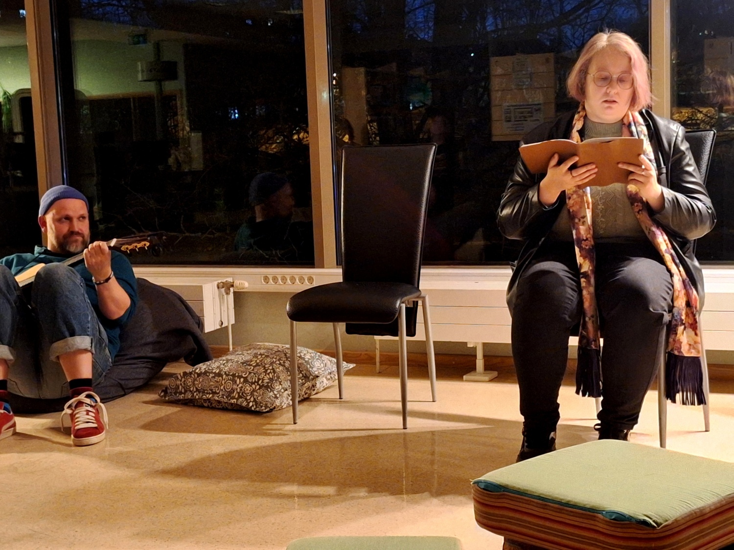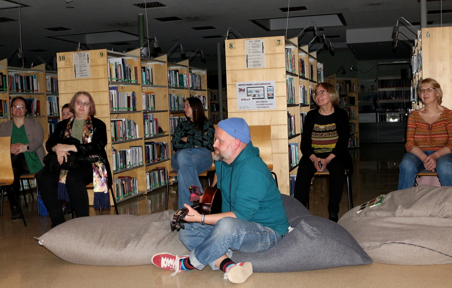 Piektdienas vakars nepulcēja daudz dalībnieku, bet sanākušos cilvēkus vienoja gan mūzika, gan vakara krēsla un kopējā gaisotne. Mijoties Mikus dziesmām ar Ievas lasījumiem, pamazām aiz bibliotēkas logiem tumsā ietinās Gauja un deviņstāvu māju kontūras, acu skatienus piesaistīja vien tilta apgaismojuma mainīgās krāsas.