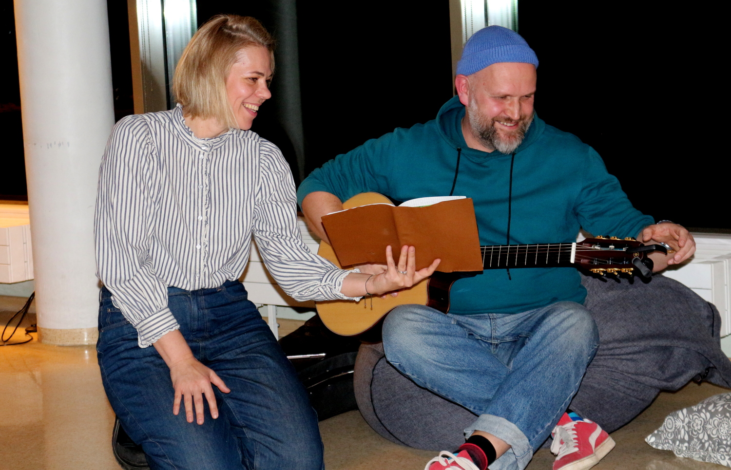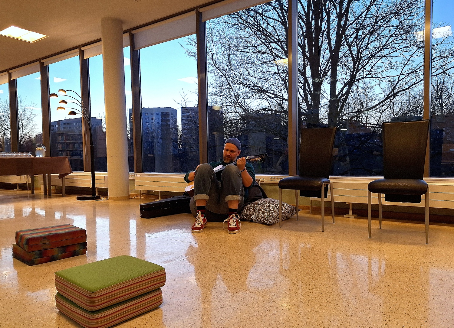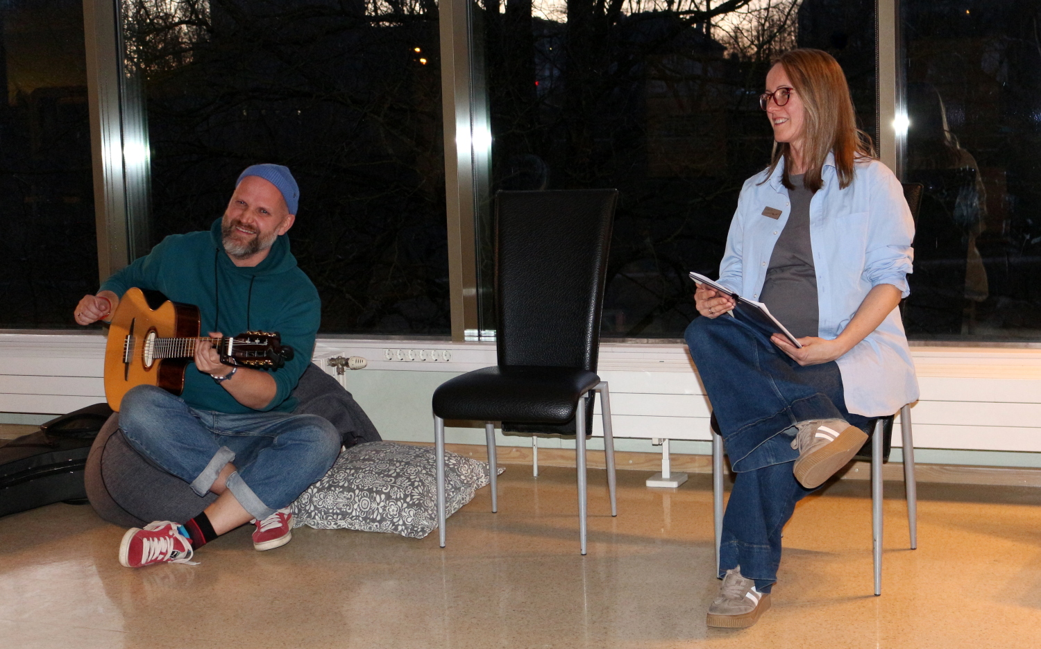 Piektdienas vakars nepulcēja daudz dalībnieku, bet sanākušos cilvēkus vienoja gan mūzika, gan vakara krēsla un kopējā gaisotne. Mijoties Mikus dziesmām ar Ievas lasījumiem, pamazām aiz bibliotēkas logiem tumsā ietinās Gauja un deviņstāvu māju kontūras, acu skatienus piesaistīja vien tilta apgaismojuma mainīgās krāsas.