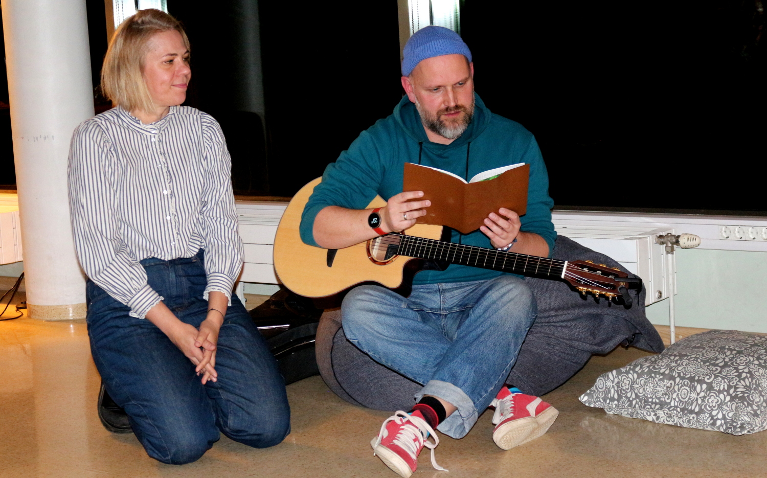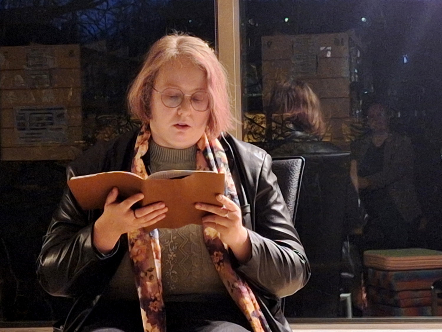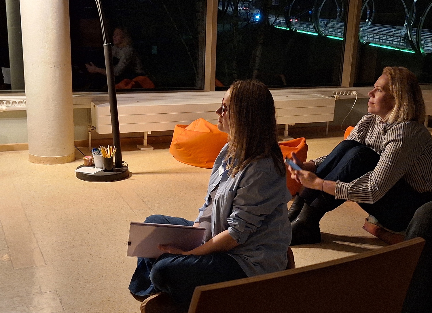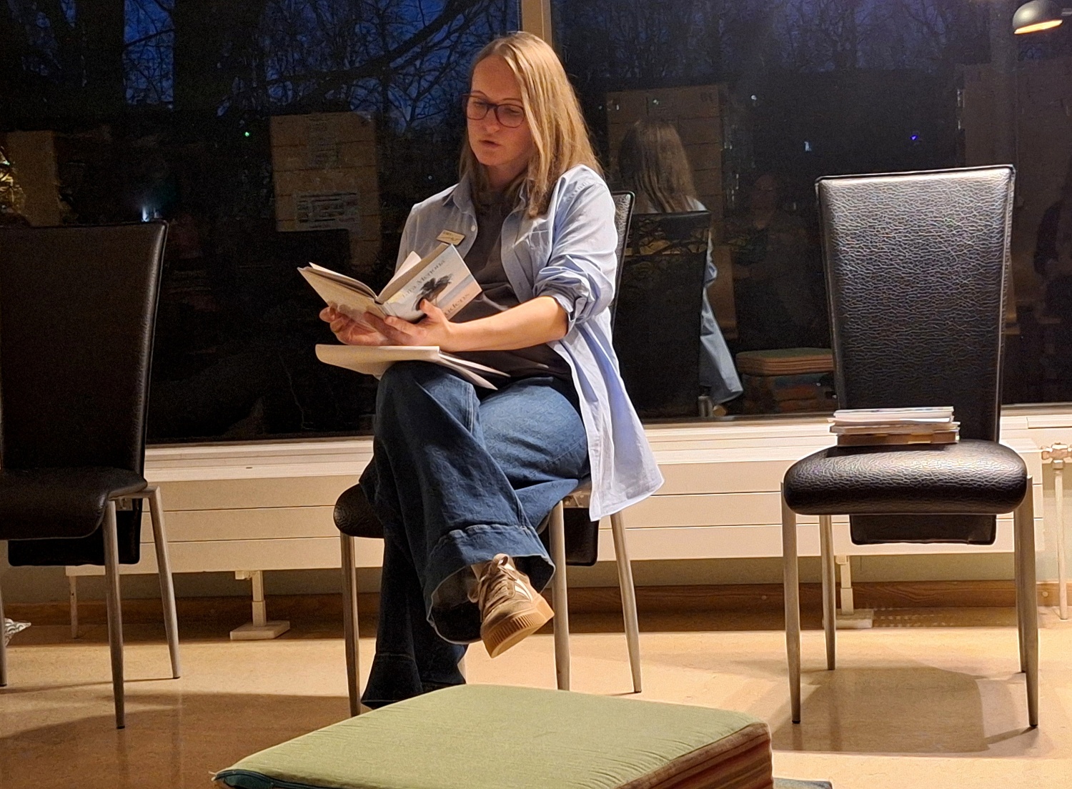 Piektdienas vakars nepulcēja daudz dalībnieku, bet sanākušos cilvēkus vienoja gan mūzika, gan vakara krēsla un kopējā gaisotne. Mijoties Mikus dziesmām ar Ievas lasījumiem, pamazām aiz bibliotēkas logiem tumsā ietinās Gauja un deviņstāvu māju kontūras, acu skatienus piesaistīja vien tilta apgaismojuma mainīgās krāsas.