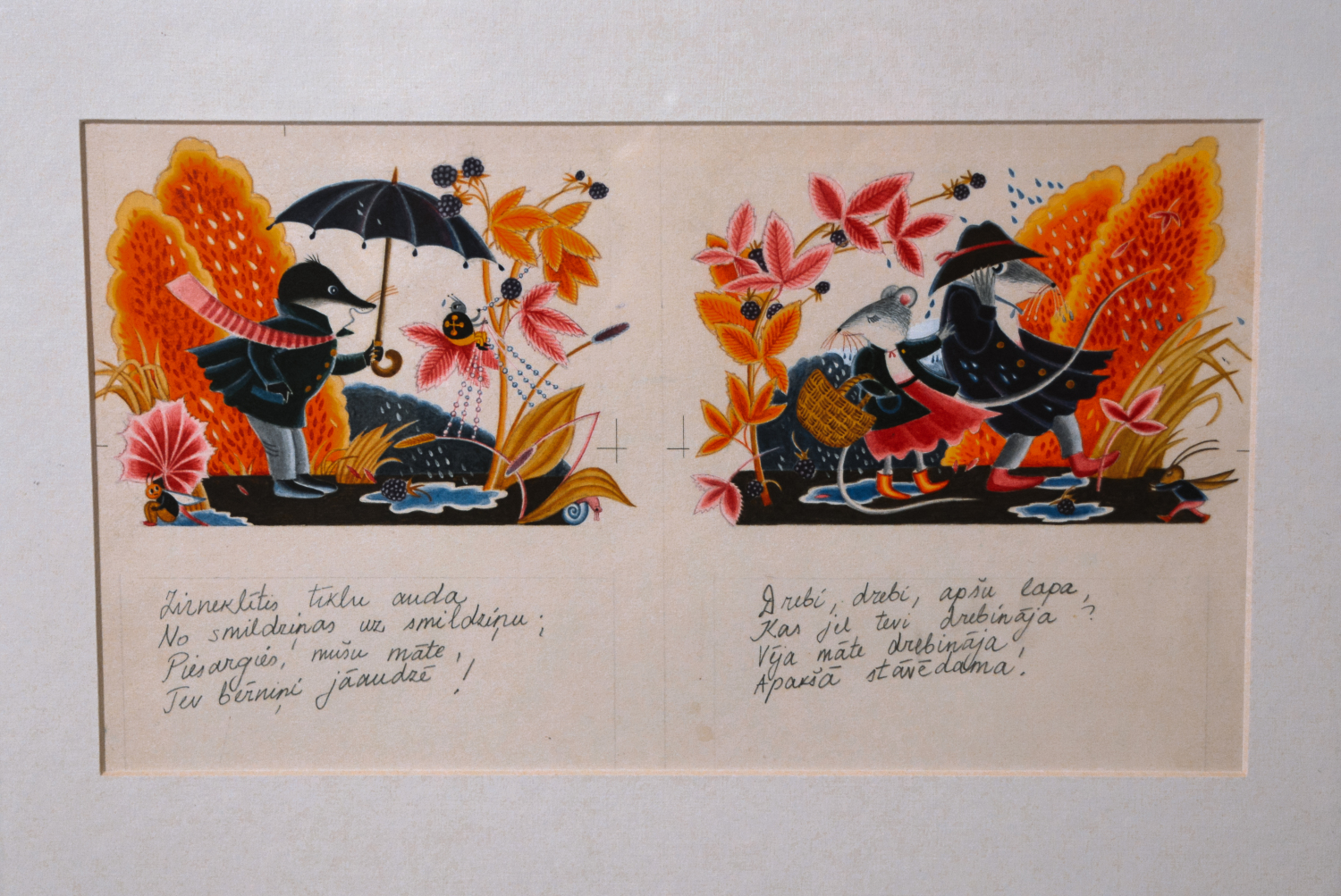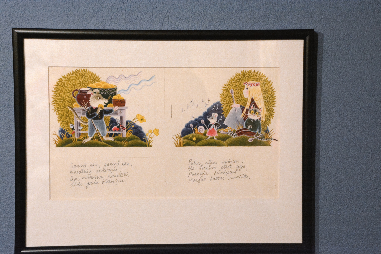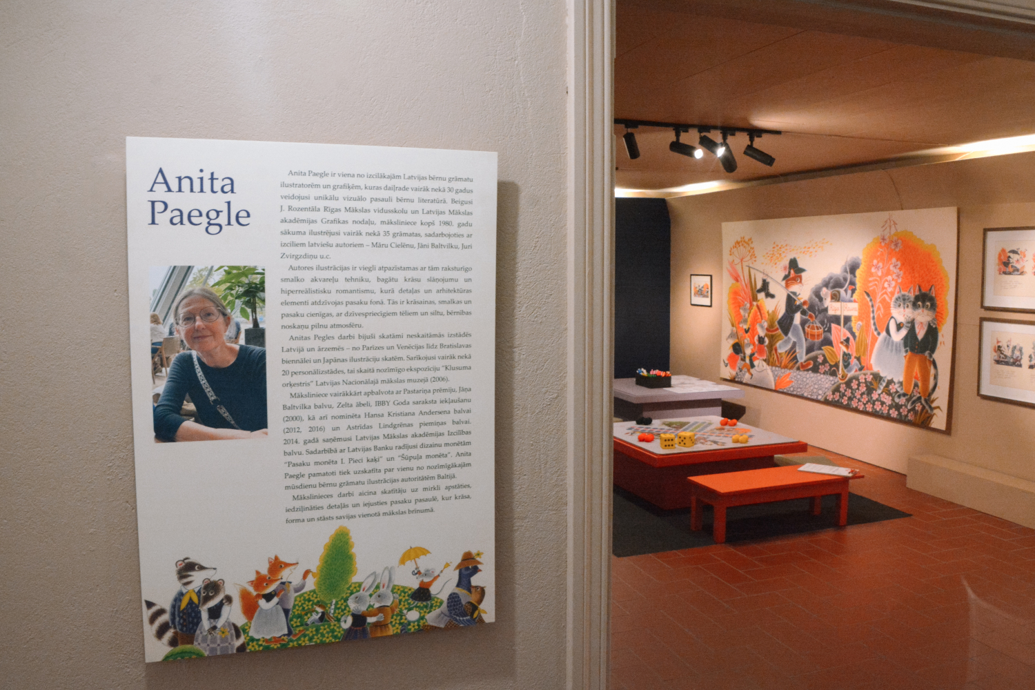 Anita Paegle ir labi pazīstama un iemīļota bērnu grāmatu ilustratore un grafiķe, kurai šis ir arī 70. dzīves jubilejas gads. No “Ods nokrita no ozola” detaļās izstrādātajiem un krāsu slāņiem bagātajiem zīmējumiem pretī raugās dažādi asprātīgi parādīti latviešu tautasdziesmu tēli, piemēram, zaķis, kaķis un peles, vilks un kurmis, gailis un dzenis, vēl daudz citu dzīvnieku pasaules iemītnieku, kuri savās darbībās izteiksmīgi attēloti, uzvedamies gluži kā cilvēki. Tāpat starp ilustrāciju varoņiem ir arī cilvēkbērni. To visu uzlūkojot, pārņem sajūta, ka esi nonācis krāšņā, emociju pilnā pasakā. Pieaugušajiem šī izstāde varētu šķist kā atgriešanās bērnībā. Izdevums “Ods nokrita no ozola” noteikti ir pazīstams daudzās ģimenēs – ja ne šodien, tad nedaudz agrāk noteikti. Arī māksliniecei jau kopš mazotnes paticis lasīt tautasdziesmas, tādēļ šī pašas ilustrētā grāmata ir sirdij ļoti tuva. Saredzot latvju dainās ietverto vēstījumu, viņai izdevies uzburt tikpat skaistu pasauli mākslas valodā.