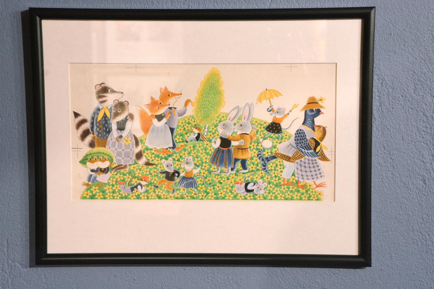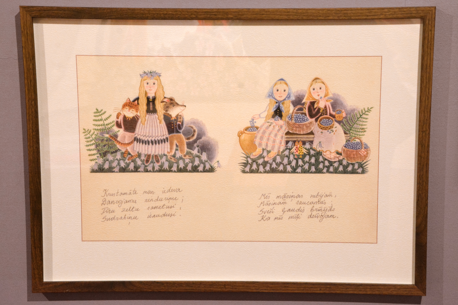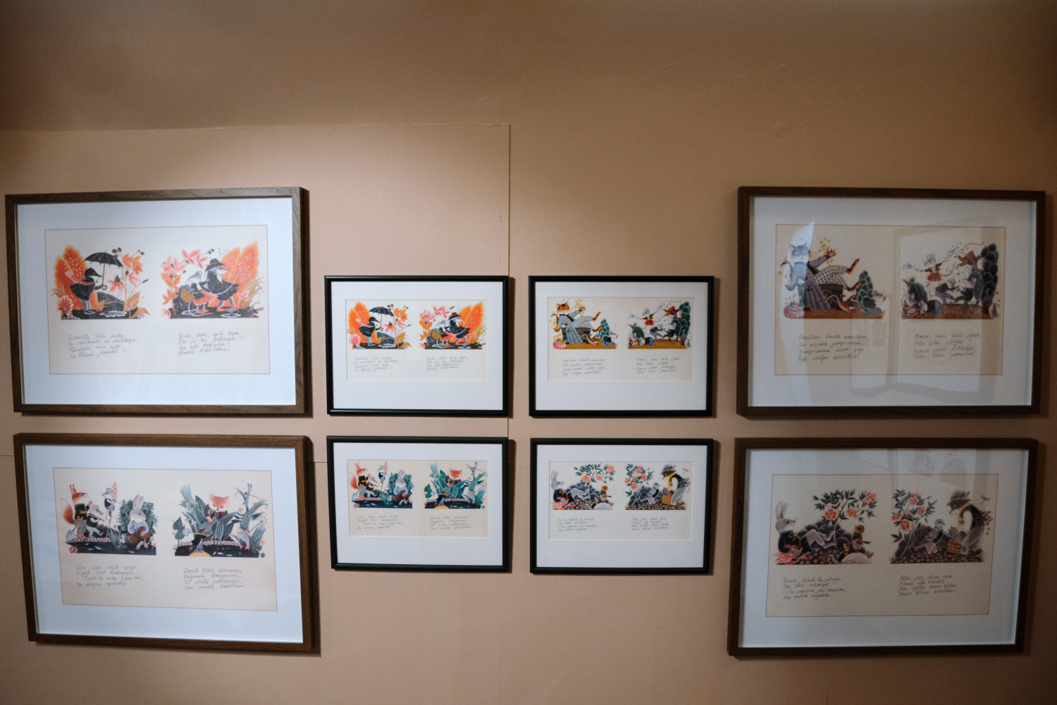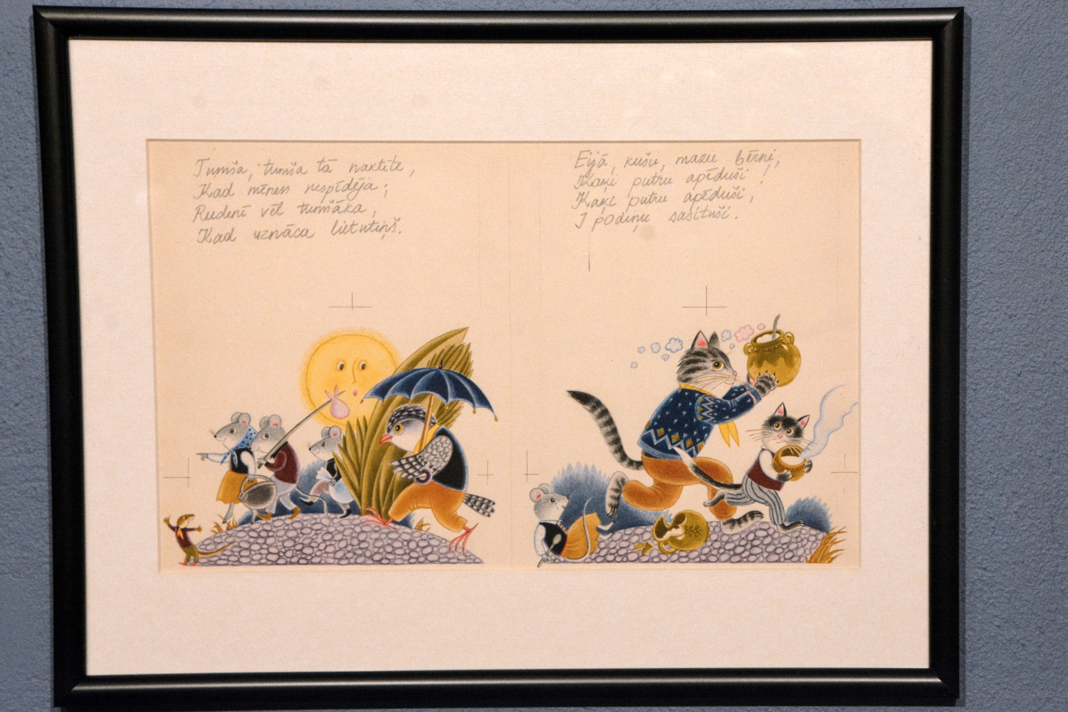 Anita Paegle ir labi pazīstama un iemīļota bērnu grāmatu ilustratore un grafiķe, kurai šis ir arī 70. dzīves jubilejas gads. No “Ods nokrita no ozola” detaļās izstrādātajiem un krāsu slāņiem bagātajiem zīmējumiem pretī raugās dažādi asprātīgi parādīti latviešu tautasdziesmu tēli, piemēram, zaķis, kaķis un peles, vilks un kurmis, gailis un dzenis, vēl daudz citu dzīvnieku pasaules iemītnieku, kuri savās darbībās izteiksmīgi attēloti, uzvedamies gluži kā cilvēki. Tāpat starp ilustrāciju varoņiem ir arī cilvēkbērni. To visu uzlūkojot, pārņem sajūta, ka esi nonācis krāšņā, emociju pilnā pasakā. Pieaugušajiem šī izstāde varētu šķist kā atgriešanās bērnībā. Izdevums “Ods nokrita no ozola” noteikti ir pazīstams daudzās ģimenēs – ja ne šodien, tad nedaudz agrāk noteikti. Arī māksliniecei jau kopš mazotnes paticis lasīt tautasdziesmas, tādēļ šī pašas ilustrētā grāmata ir sirdij ļoti tuva. Saredzot latvju dainās ietverto vēstījumu, viņai izdevies uzburt tikpat skaistu pasauli mākslas valodā.