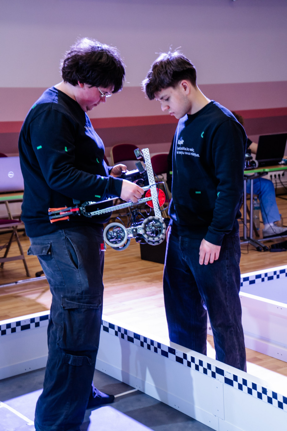 Darba uzdevums prasmju konkursa “Mobilā robotika” pusfinālā sastāvēja no divām daļām, kur uzdevuma pirmā daļa bija robota pārvietošanās un orientēšanās telpā, izbraucot noteiktu maršrutu. Bet darba uzdevuma otrajā daļā robotam bija jāveic dažādu objektu atpazīšana pēc krāsas, kā arī jāpārvieto šie objekti uz norādītajiem punktiem arēnā. Kopumā darba uzdevuma izpildei tika dotas 5 stundas. Valmieras tehnikumu pārstāvēja Mareks Slaidiņš un Adrians Augustovskis.